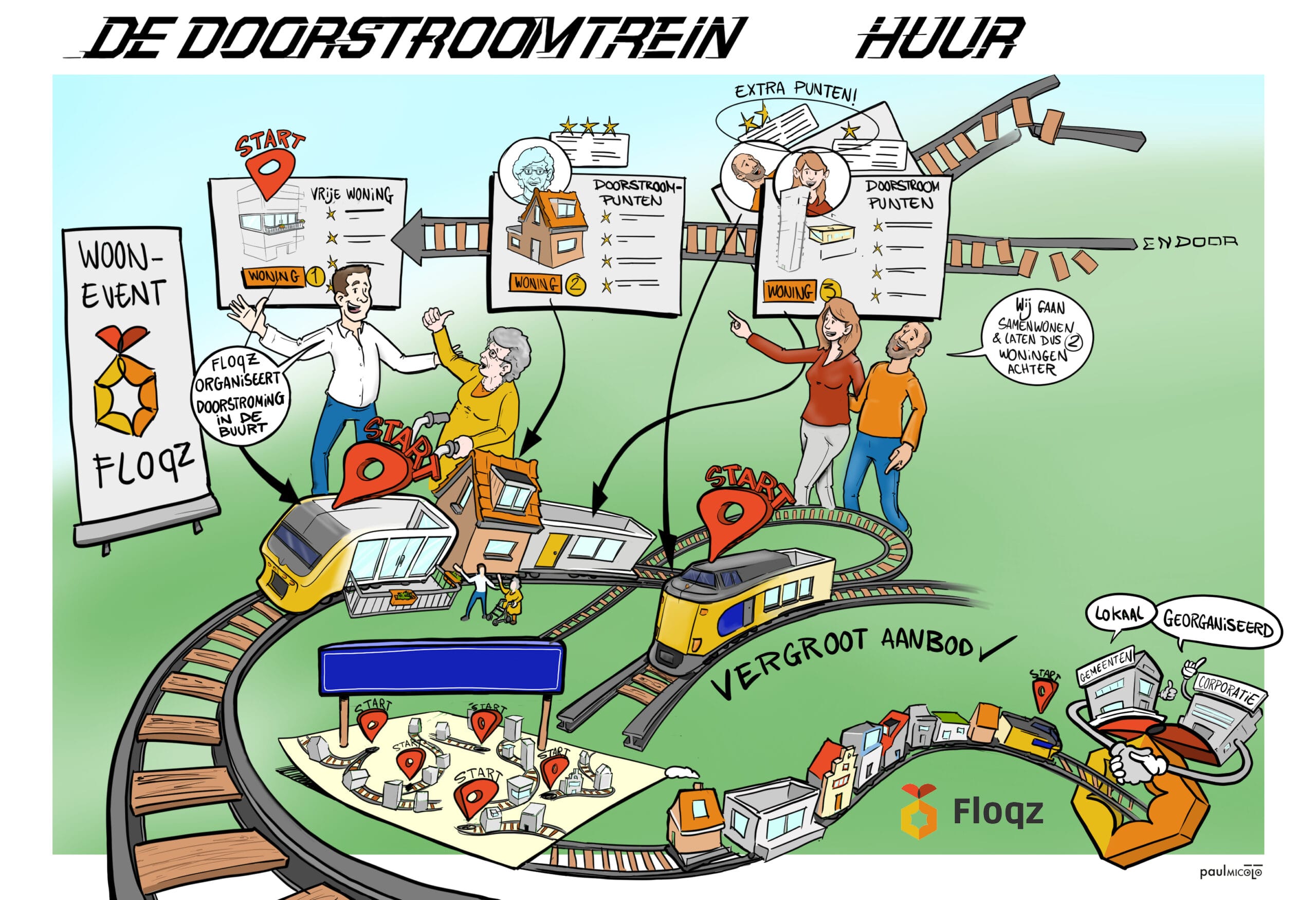 De Doorstroomtrein is ontwikkeld om woningzoekenden meer kans te geven om binnen de eigen omgeving te blijven wonen door met elkaar lange ketens van verhuizingen te maken. In eerste instantie is de Doorstroomtrein ontworpen voor de koopsector, maar we zijn ook het concept aan het uitwerken voor de sociale huursector.